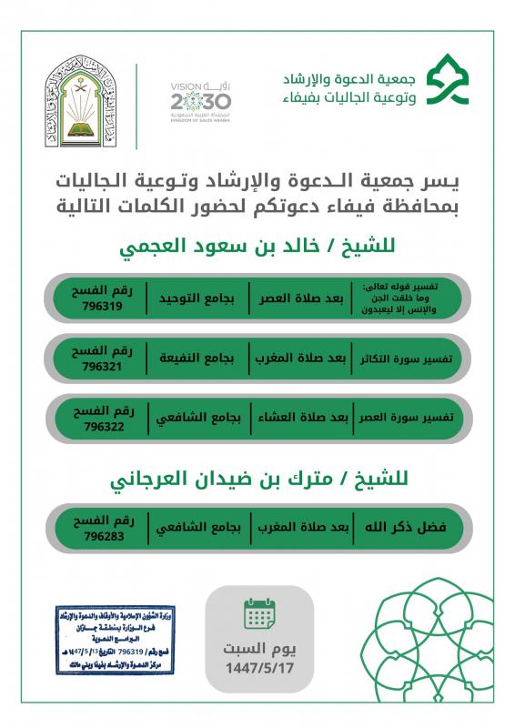 يسر جمعية الدعوة فيفاء دعوتكم لحضور الكلمات التالية